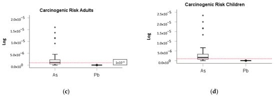 Healthy risk in the Aconcagua River basin without mining activity: (a) non-carcinogenic risk in adults, (b) non-carcinogenic risk to children, (c) carcinogenic risk in adults, and (d) carcinogenic risk in children. The red dotted lines show the risk values.