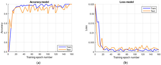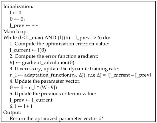 In the proposed algorithm, the controller’s parameters are updated according to (10): θ₍ₗ₊1₎ = θ₍ₗ₎ − ηₗ · (W · ∇J), where the dynamic training rate, ηₗ, is adjusted based on the change in the optimization criterion, which allows for adapting the optimization step as it approaches the minimum of the function J (see (10)–(12)). The stopping conditions specified in (12)–(14) ensure that the iterative process is completed when the difference between the J values at successive steps becomes lower than a given threshold, which prevents overtraining. Regularization is used to stabilize the algorithm: adding the coefficient λ to the Hessian matrix, H(J) in (15), and checking for positive definiteness using Sylvester’s criterion (16) minimizes the influence of noise and nonlinearities. In addition, the choice of switching function, g(t) in (4), where the parameter α determines the exponential decay rate and the coefficients k1, k2, and k3 regulate the gain level, allows one to precisely balance the controller’s speed and stability under dynamically changing control conditions.