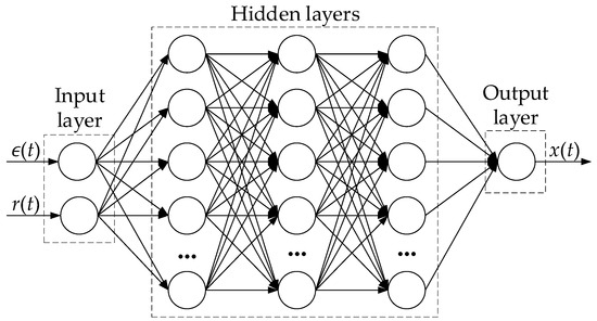 To implement the proposed method in neural network form, an architecture is proposed (Figure 3), which includes consideration of adaptive parameters and system nonlinearities, as well as an algorithm for its training (Table 2). The proposed neural network architecture (Figure 3) is built on a multilayer structure, including input, hidden and output layers. The input layer accepts two key parameters: the system error ϵ(t) and the reference action r(t), which the system’s dynamic behaviour determines. The hidden layers consist of three fully connected levels with nonlinear activation functions, such as SmoothReLU and tanh [32,33], to model complex nonlinear relations in the system.