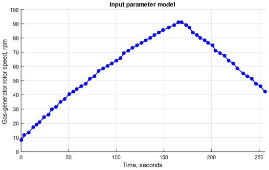 Based on the numerous research results devoted to helicopter turboshaft engine (TE) monitoring methods, including the research in [32,33,34,35,36,37,38], the TV3-117 engine, which is part of the Mi-8MTV helicopter power plant [39,40], was chosen as the research object for the computational experiment. The main diagnostic parameter recorded by the standard onboard sensor D-2M [32,41] is the gas-generator rotor speed, nTC. The nTC values were obtained exclusively from the Mi-8MTV helicopter flight test data. Data were collected for 256 s under actual flight conditions at the nominal engine operating mode with a sampling interval of 1 s. The base frequency value, nTCreq, was set equal to 15,900 rpm [31,40]. The data were provided to the authors’ team upon an official request to the Ministry of Internal Affairs of Ukraine within the framework of the project “Theoretical and Applied Aspects of Aviation Sphere Development”, registered under number 0123U104884. The changes in the nTC frequency recorded under the operating conditions of the TV3-117 engine demonstrate the time series complexity (Figure 4), and the constructed diagrams emphasize the importance of the current parameter values and their accumulation in the model’s memory [42,43]. In accordance with the recommendations provided in [32,33,34,35,36,37,38], the 256 nTC values presented in Figure 4 were selected for analysis. The time sampling and adaptive quantization with a dynamic range applied to the reconstructed nTC signal [33] resulted in its discretized form (points in Figure 4).