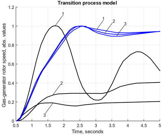 The transient processes’ nTC(t) diagrams, reflecting the dynamics in the initial (black curves) and final (blue curves) states of the automatic parametric optimization algorithm’s operation: 1—parameter set 1; 2—parameter set 2; 3—parameter set 3 (note: the values of parameter sets 1, 2, and 3 are presented in Table 5).