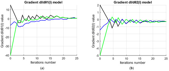 Diagrams of the values of the gradient components, (a) and (b) of the optimization criterion J during the automatic parametric optimization algorithm’s operation: (black curve)—parameter set 1; (blue curve)—parameter set 2; (green curve)—parameter set 3 (note: the values of parameter sets 1, 2, and 3 are presented in Table 5).