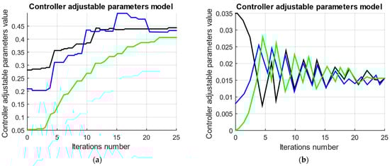 Diagrams of the controller-adjustable parameters (a) and (b) during the automatic parametric optimization algorithm’s operation: (black curve)—parameter set 1; (blue curve)—parameter set 2; (green curve)—parameter set 3 (note: the values of parameter sets 1, 2, and 3 are presented in Table 5).