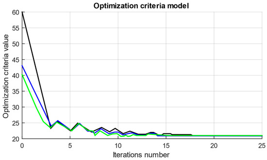 Diagrams of the optimization criterion values during the automatic parametric optimization algorithm’s operation: (black curve)—parameter set 1; (blue curve)—parameter set 2; (green curve)—parameter set 3 (note: the values of parameter sets 1, 2, and 3 are presented in Table 5).