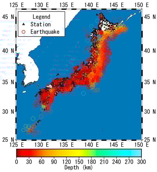 This paper uses the datasets from Japan’s K-NET and KiK-net networks, covering earthquake records from ground stations from January 2008 to June 2021. The dataset contains 8144 seismic events and 297,099 sets of three-component acceleration records. The magnitude of the events ranges from 3.0 to 7.7 (the MJMA magnitude is used uniformly), the depth ranges from 0 to 300 km, the longitude of the epicenter ranges from 122.267 E to 148.84 E, and the latitude of the epicenter ranges from 23.320 N to 45.985 N (Figure 1). The sampling frequency of the records from the stations is 100 Hz and the distance between the epicenters ranges from 0.11 to 299.88 km. A signal-to-noise ratio (S/N ratio) exceeding ten was selected to ensure the data quality. In order to ensure the data quality, events with a signal-to-noise ratio of more than ten and with more than five sets of three-component acceleration waveforms were selected.