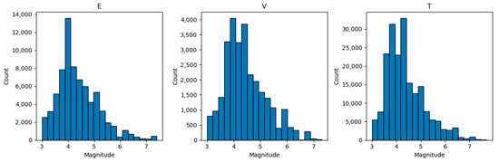 Distribution of the amount of data with magnitude for the training set (E), validation set (V), and test set (T).