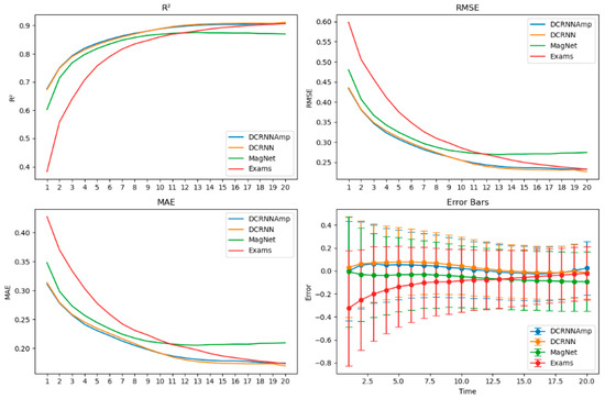 When comparing R2 values, the DCRNN and DCRNNAmp achieve scores of 0.667 and 0.676, respectively, in the first second. These values are significantly better than MagNet’s score of 0.580 and Exams’ score of 0.383. As time progresses to the eighth second, the Exams model gradually improves and surpasses MagNet, reaching an R2 value of 0.816. However, it still falls short of the DCRNN and DCRNNAmp, which maintain R2 values of 0.863 and 0.861.