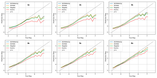 Additionally, we assessed the linear correlation between the predicted and true magnitudes by calculating the correlation coefficient. The data presented in Figure 5 indicate that the correlation coefficients for DCRNNAmp and DCRNN are both 0.82 from the start and onward. This performance is significantly better than that of MagNet (0.78) and Exams (0.76). Furthermore, the correlation coefficients for all models show a gradual increase with the extension of the time window, further confirming the continuous improvement in model performance.