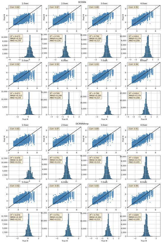 The results presented in Figure 4 further confirm that the overall performance of the DCRNN and DCRNNAmp in the magnitude estimation task has a significant advantage over MagNet and Exams. In order to analyze the error distribution characteristics of these models in more depth, we introduce a plot of the predicted magnitude versus the true magnitude during the first 8 s, as well as a histogram of the error distribution. The error distribution histogram reveals that the error data follow a Gaussian distribution.