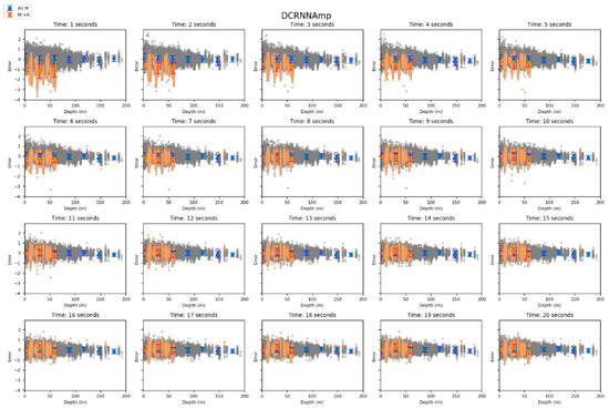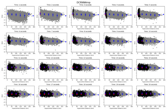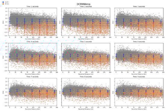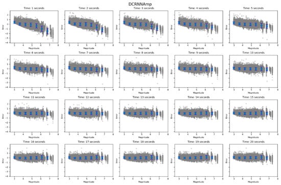In order to explore the performance of the DCRNN in in-depth real-time earthquake estimation, we analyze the change in its magnitude estimation results over time in detail (Figure 9). The results show that the DCRNN has a prominent phenomenon of “overestimation for small earthquakes and underestimation for large earthquakes” in the first 3 s when predicting earthquakes of different magnitudes. However, by the third second, the underestimation of large earthquakes has been significantly improved, and the average value of the errors for the whole magnitude range has been gradually reduced. By the 5th second, the overestimation of small earthquakes has also been effectively improved. After 6 s, the overall mean error stays near 0, which indicates that the magnitude estimation performance of the DCRNN continues to improve with time.