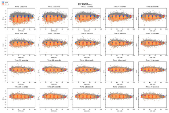 Both the overall error and the large seismic error converge with increasing SNR (Figure 7). Since the near shocks can mostly be categorized as high-SNR, the higher the SNR, the smaller the mean value of the errors, which is in line with the objective law. In the first second, the overall mean error tends to be 0. However, the negative error region is more expansive, indicating that the underestimated events are more discrete, while the overestimated events are relatively concentrated. The mean errors of large earthquake events in all SNR segments are located in the negative region, and the standard deviations of the errors are significantly more significant than the overall performance, indicating that most large earthquake events are significantly underestimated and the underestimation errors are significant. However, with the time window extension, the overall error and the large seismic error gradually converge and the mean value of the large seismic error tends to be close to zero.