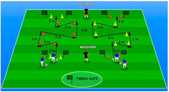 Dribbling the ball with changes in direction, right and left obstacle course (adapted from [36]).