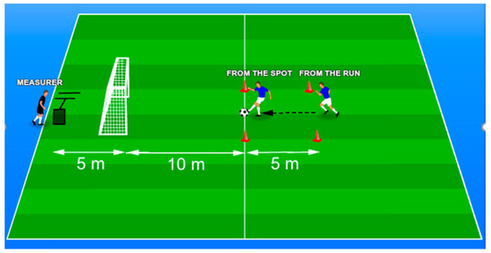 The measurer stands behind a radar gun, which is placed on a stand at a height of 90 cm and 5 m behind the goal. Additionally, 10 m in front of the goal, the place where the ball is to be kicked is marked with two cones set 5 m apart. Then, 15 m in front of the goal, the place where the ball is to be kicked out of the goal is marked with two cones set 5 m apart. Task 1: The test subject places the supporting leg next to and behind the ball and kicks the ball into the goal from the spot with the inside of the foot with maximum force without moving the supporting leg. Task 2: The test subject takes a running start 5 m from the ball, runs to the ball, and kicks the ball into the goal with the inside of the foot with maximum force. The radar gun recognises the fastest object (ball) in the space and measures the maximum speed of the ball in the direction of the goal in km/h with an accuracy of up to 0.1 km/h. The test subject has 3 attempts each with the right and left foot for shots without and with a run-up, i.e., 12 attempts in total. All results are recorded, and the best results are used for statistical analysis.