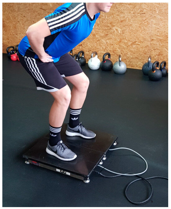 From a standing position with their feet hip-width apart, the subject begins to lower into a half squat as quickly as possible (up to a hip and knee flexion position of 90°), and decelerates the vertical downward movement and transitions from lowering to vertical lifting as quickly as possible—with the aim of pushing off as quickly and as high as possible [40]. The gaze was directed forwards and the palms rested on the hips during the entire jump. The depth of the vertical descent was carefully monitored by the measurer. After a two-second stabilisation in the starting position, which was monitored by the measuring device (stabilisation of the force–time curve), the subject began to move downwards as quickly as possible in order to jump as high as possible in response to the signal from the measurer (“hop”). The reliability of the jumping performance was monitored by the measurer. Repetitions in which the subject lifted five feet off the ground during the jump or the jump height was too low to go into a half squat were excluded from the evaluation. Each subject performed three valid repetitions. If there were problems with the quality of the performance, the measurements were repeated, with none of the test subjects completing more than six jumps. The jump height and the relative maximum power of one and the other leg in W/kg were measured with an accuracy of 0.01. We included the mechanical variables of the jump in which the subject jumped the highest in the statistical analysis [41].