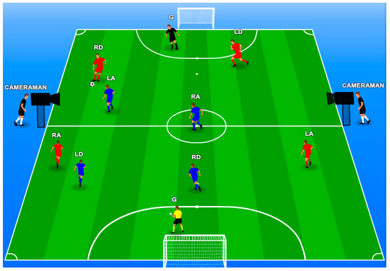 Figure 4 shows a four-on-four football match with two goals and goalkeepers. The players are lined up in a 1–2–2 formation: goalkeeper (G)–left defender (LD) and right defender (RD)–left attacker (LA) and right attacker (RA). The setup of the cameramen with cameras can also be seen.