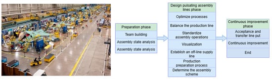 The pulsating assembly flow shop represents a significant approach to enhancing assembly efficiency in modern manufacturing. It is characterized by advanced industrialization, robust production rhythms, and high levels of digitization. This method is widely utilized in modern manufacturing, particularly within the aerospace industry. In 2000, Boeing pioneered the first pulsating assembly line, employing it for the production of Apache helicopters. The workflow of a pulsating assembly flow shop, illustrated in Figure 1, encompasses several stages. These stages include preliminary preparation, pulsation assembly line design, and continuous improvement [].
