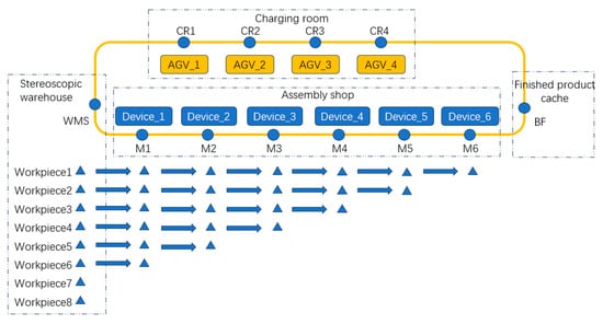 At the start of production, all workpieces are stored in the Warehouse Management System (WMS), and all AGVs are docked in the charging room. The first workpiece to be processed is selected from the processing sequence, and the AGV scheduling system assigns an AGV to perform the task according to the selected strategy. The scheduling task is divided into three stages as follows. First, the AGV moves from the standby position to the workpiece pick-up location, from the charging room to the WMS; second, the AGV transports the workpiece from the pick-up location to the delivery position, moving from the WMS to the first processing machine of the first workpiece; finally, the AGV selects a docking position based on the scheduling strategy. Once the processing machine receives the workpiece, it begins the processing task. Once processing is complete, the call operation begins. The AGV scheduling system then performs the next task based on the call operation. This continues until all processes for all workpieces are completed and transported to the finished product buffer (BF).