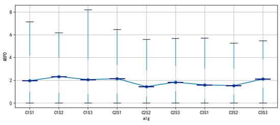 Evaluation of the performance of the nine heuristic algorithm strategies was conducted by comparing the relevant data for each strategy. Figure 3 presents the Average Percentage Relative Deviation (APRD) for all strategies. The results indicate that C1S3 exhibits the largest fluctuations, with a deviation span of approximately 8. In terms of numerical values, all strategies are closely clustered around 2, with C2S2 showing the smallest deviation and C1S2 showing the largest.