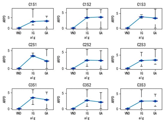 A comparison of the performance of the three algorithms under different strategies is shown in Figure 4. The ARPD values of the VND algorithm are consistently close to 0 across the nine strategies, indicating its significant superiority. In contrast, the ARPD values of IG and the GA fluctuate across strategies, with notably larger increases when strategy complexity is higher, suggesting that these algorithms have weaker adaptability to complex scheduling tasks.