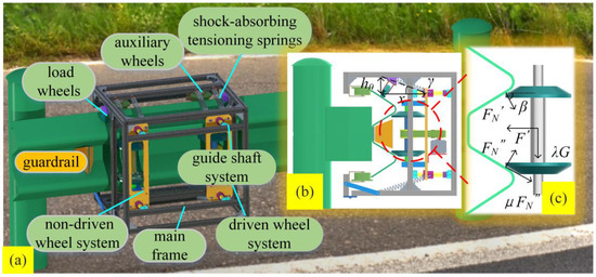 When the robot is patrolling on the guardrail, its passability and stability must be ensured while preventing it from detaching from the guardrail. Based on the shape and dimensions of the double-corrugated beam guardrail, this study designs a mobility mechanism tailored to fit the guardrail. The mechanism incorporates an adaptive bilateral-wheel tensioning structure, ensuring a secure and stable fit on the guardrail. The driving system employs a simpler unilateral driving mode, which not only reduces the robot’s weight, but also simplifies its overall structure. As shown in Figure 1a, the guardrail inspection robot primarily consists of the following components: the main frame, driven wheel system, non-driven wheel system, guide shaft system, auxiliary wheels, load wheels, and shock-absorbing tensioning springs.