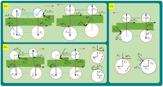 When the robot is in the front auxiliary wheel obstacle-crossing state (FAOC), the force analysis is illustrated in Figure 3a. The static equilibrium equations are as follows: