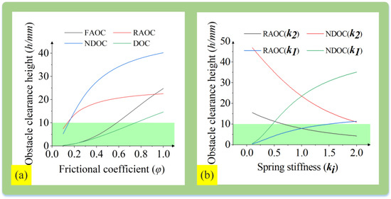 Regarding the coefficient of adhesion φ, the spring stiffness k1 on the active wheel side, and the spring stiffness k2 on the passive wheel side, the control variable method is employed to analyze the influence of these parameters on the obstacle-crossing height. When analyzing the influence of a certain parameter on the obstacle-crossing performance, the other parameters are held constant at fixed values (φ = 0.8, k1 = 2, k2 = 0.5).