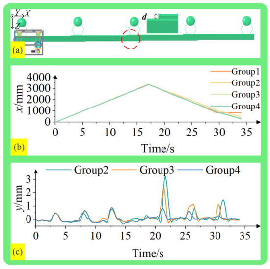 Simulation diagram of barrier section for level obstacles. (a) Schematic diagram of the straight obstacle guardrail section, where the obstacle marked by the red dashed line is 10 mm, which is the preset obstacle value mentioned above. (b) Displacement of the robot in the X-direction on the straight obstacle section. (c) Displacement of the robot in the Y-direction on the straight obstacle section.