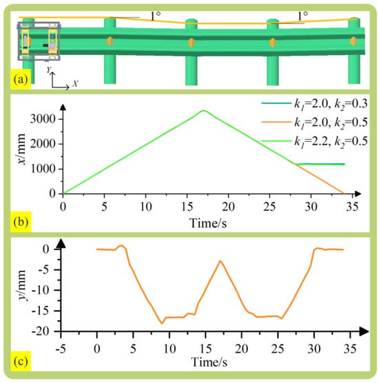 When k1 is set to 2 and k2 is set to 0.5, the robot can smoothly cross both the uphill and downhill slope obstacles. Its displacement in the X- and Y-directions is shown in Figure 7b,c, respectively. The other two parameter groups exhibit jamming phenomena, and the reason is the same as previously described: a mismatch in forces between the active and passive sides. Through analysis, it can be observed that the displacement curve on the slope obstacle guardrail section is symmetrical, further proving that the robot exhibits excellent adaptability to the guardrail under the third group of spring stiffness parameters.