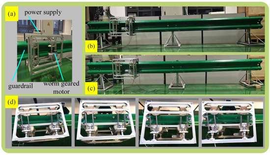 The overall framework of the guardrail inspection robot developed in this study is constructed using 20 mm × 20 mm aluminum profiles, with other components made of aluminum alloy 6061. The motor selected is a worm gear reduction motor with a reduction ratio of 1:862 and a rated torque of 20 Nm. It is installed on the active gear train side, and power transmission is achieved through synchronous belts. The complete prototype of the robot is shown in Figure 8a. The guardrail inspection robot’s motor is powered by a 24 V, 1 A direct current, and its reciprocating motion—controlled by the forward and reverse rotation of the motor—is managed using two switches.