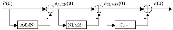 Many modern lossless coding algorithms have cascade organization; the main predictor (here, an AdNN) is followed by a single stage or by several stages of NLMS (Normalized Least Mean Square) filters; see Figure 4. Image pixels are coded independently row after row from the top down, and from left to right. Then, computed according to (2), AdNN errors are processed by NLMS stages, followed by the prediction bias cancellation procedure in the block; see Figure 4. The most advanced update formulas for NLMS coefficients used here, and for definition, can be found in [12]. Two NLMS sub-stages of rank and are implemented. This is the data modeling part of the coder; it is followed by an advanced adaptive context arithmetic coder, which is fully described in [12].