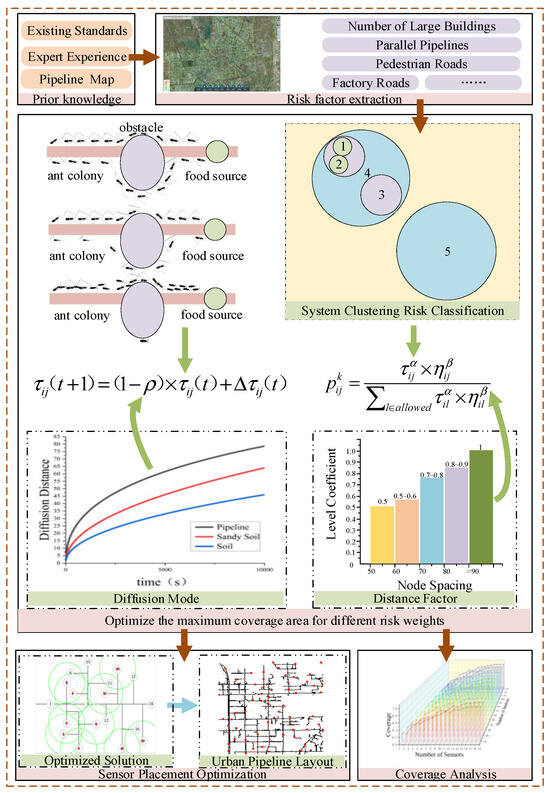 Ant colony algorithms, which simulate ant foraging behavior, are increasingly used to optimize sensor placement by strategically positioning sensors around high-risk nodes for real-time monitoring [15,16,17]. However, these algorithms can face challenges such as high computational complexity and slow convergence in large-scale problems [18]. In summary, while system clustering improves risk analysis and supports safety measures, limitations like data quality, algorithm selection, and subjective judgment remain. Future research could integrate machine learning and data mining to enhance urban gas network safety and reliability [19,20].