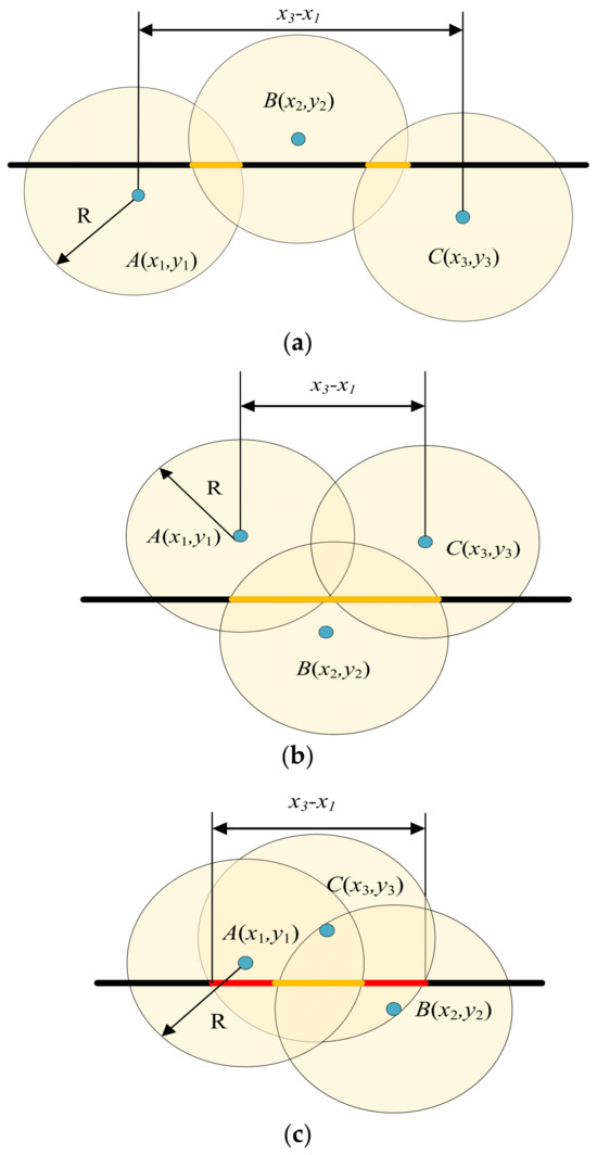 As depicted in Figure 2a, if a segment of the pipeline within point B’s monitoring range is not covered by adjacent points, then point B must remain a monitoring point to maximize pipeline coverage. In Figure 2b, as the distance between points A and C decreases, point B’s monitoring range becomes fully covered by points A and C, placing B at the critical threshold where its necessity as a monitoring point is uncertain. In Figure 2c, with further reduction in the distance between A and C, point B’s monitoring range is entirely encompassed by points A and C, indicating that point B no longer needs to be a monitoring point as its area is adequately monitored by points A and C.