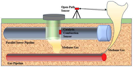 Figure 3 delineates two primary propagation paths of methane from the leakage source to the detection point. Firstly, methane may leak from the underground gas pipeline into the surrounding soil. If there are cracks, joints, or openings in the adjacent parallel pipeline, the leaked methane can migrate through the soil and enter this pipeline system due to pressure and diffusion gradients. Once inside the parallel pipeline, the methane will travel along it and eventually diffuse upward into the inspection manhole. Within the manhole, catalytic combustion sensors detect and confirm the gas leak. Additionally, methane may directly diffuse from the soil surface into the air, where open-path laser sensors located outdoors monitor the gas, particularly suitable for open areas.