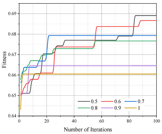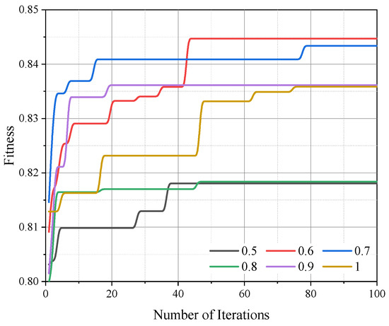 Next, the β parameter is adjusted, ranging from 0.5 to 1.0, with increments of 0.1. The performance changes over 100 iterations were recorded and displayed in Figure 6. The experimental results indicate that when the β value is set between 0.7 and 0.8, the algorithm’s performance improves rapidly and ultimately stabilizes at around 0.70, the highest performance value. This result shows that moderately high β values help the algorithm explore effectively during iterations and quickly reach high-quality solutions. In comparison, lower β values, such as 0.5 and 0.6, result in slower initial performance improvements, with final performance stabilizing at around 0.67 and 0.68. Higher β settings, such as 0.9 and 1.0, result in smoother performance improvements but slightly lower final performance, stabilizing at approximately 0.69 and 0.68, respectively.