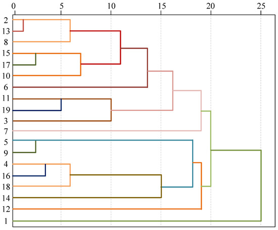 To optimize sensor placement and improve monitoring efficiency, the dendrogram provides a detailed depiction of the clustering process of these nodes based on similarity and features. The horizontal axis in the diagram shows the distance or similarity metric at the time of cluster merging, with larger values indicating greater differences between merged clusters, signifying more distinct characteristics among these nodes. The vertical axis clearly lists the node numbers involved in the clustering process, ranging from 1 to 19.
