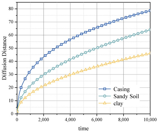 Figure 12 demonstrates that methane diffusion behaves significantly differently across various media. Diffusion in the air within a casing pipe occurs with fewer physical obstructions, resulting in the fastest diffusion speed and the longest diffusion distance. Diffusion in clay is slowed down due to higher resistance and a more complex physical structure. Diffusion in sandy soil, which has properties between clay and air, reflects the impact of soil density and humidity on methane diffusion. These diffusion curves not only provide a clear understanding of methane’s behavior under different environmental conditions but also emphasize the critical influence of environmental characteristics on the diffusion process.
