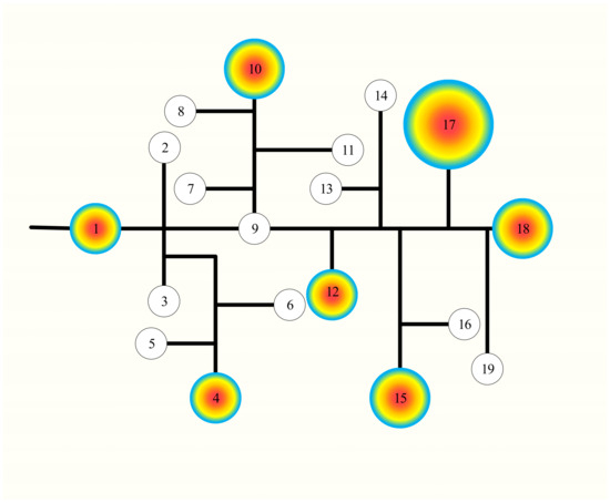 The data from Table 1 are analyzed through systematic clustering to classify the risk levels of each inspection well. In this study, a hierarchical clustering method is applied to classify 19 nodes in the urban gas pipeline network. The aim is to conduct a risk assessment and category classification based on the number of key facilities and potential safety hazards surrounding each node. First, various data points were collected for each node, including the presence of large buildings, government departments, different types of roads, parallel pipelines, power cables, and more. Each factor is represented in binary form, indicating whether it is present or absent.