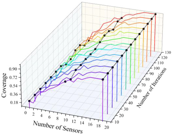 Through the optimization process using the ant colony algorithm, we observed changes in sensor coverage with varying numbers of sensors and iterations. For simplicity, the sensor detection range is considered to be 50 m. Figure 3, Figure 4, Figure 5, Figure 6, Figure 7, Figure 8, Figure 9, Figure 10, Figure 11, Figure 12, Figure 13, Figure 14, Figure 15, Figure 16 and Figure 17 show that, as the number of iterations increases, the coverage rate gradually improves, highlighting the efficiency of the ant colony algorithm in optimizing sensor placement. In configurations with a higher number of sensors, the coverage rate increases quickly and stabilizes rapidly.
