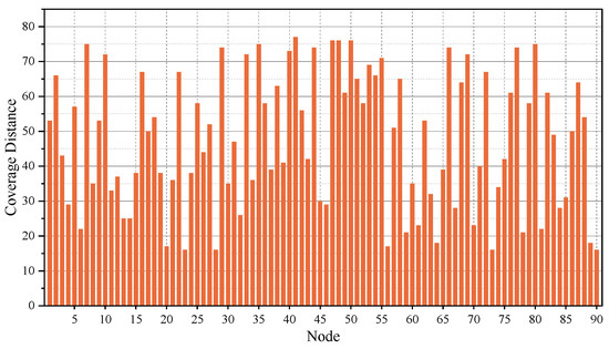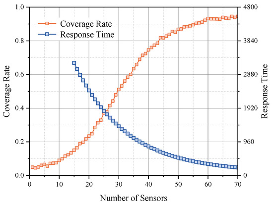 Figure 19 shows the analysis of the relationship between response time and the number of sensors, revealing that effective monitoring begins with 15 sensors, with an initial response time of 3245 s. As the number of sensors increases to 70, the response time significantly decreases to 314 s. Additionally, coverage rate analysis indicates that as the number of sensors increases from 0 to 70, the coverage rate rises rapidly from 0% to over 90%. However, when the number of sensors approaches 60, the growth in coverage rate begins to plateau. This suggests that while increasing the number of sensors can effectively reduce response time, its contribution to coverage rate diminishes after reaching a certain threshold, especially when the coverage rate approaches 90%. Beyond this point, adding more sensors has minimal impact on further improving coverage.