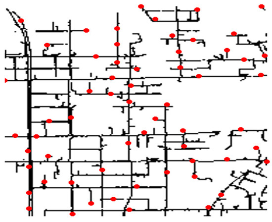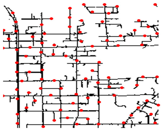 In the study of optimizing gas leak detection sensor placement in urban gas pipeline networks, it is essential to consider a wide range of key facilities and environmental factors. The factors involved in this study include large buildings, government departments, various types of roads (pedestrian roads, factory roads, and urban roads), parallel pipelines, power cables, communication cables, heating pipes, railways, and utility poles. These factors, along with previously discussed key infrastructures, high-risk facilities, traffic elements, geographical and environmental factors, historical safety data, and population density and activity frequency, form a comprehensive analytical framework for assessing the installation priority and risk level of each node, as shown in Figure 7, which provides the GIS map of the gas pipeline layout and node locations.