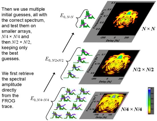 A quick review of the RANA approach [,,] may be helpful at this point. It is not a pulse-retrieval algorithm in the usual sense. Rather, it is an approach that uses an existing algorithm (here the standard generalized projections algorithm) but takes advantage of the realization that one can actually retrieve an excellent approximate pulse spectrum directly from the measured trace. It then uses a “multi-grid” approach, which means using a small subset of the trace points in the first iterations of the algorithm, then more for later iterations, and the full dataset only for the final few iterations. It also continually discards poorer results along the way. It is illustrated in Figure 1.