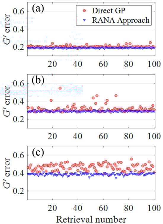As mentioned earlier, if an algorithm reliably converges, even in the presence of instability, we would expect it to achieve the minimum G or G’ error for all reasonable initial guesses. If not, then we would expect to see variations in these values depending on the initial guess. Figure 2 depicts all the G’ errors obtained from 100 runs using both the standard GP algorithm and RANA approach on noisy traces.