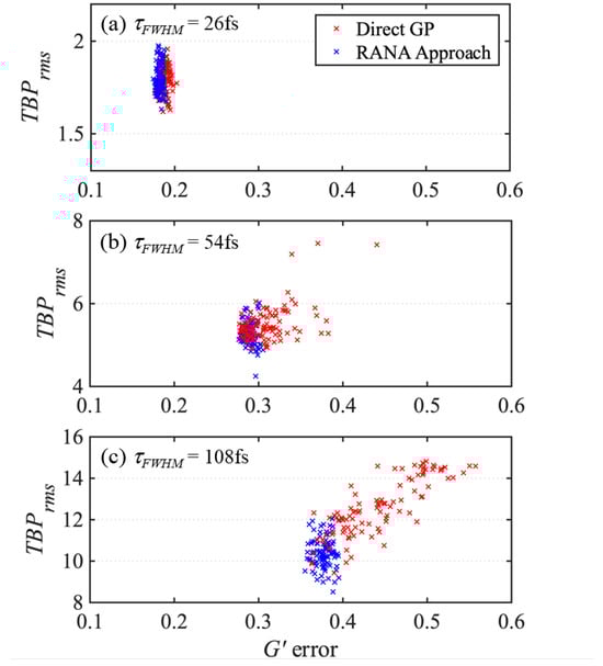 The resulting TBPrms for the retrieved pulses using the GP algorithm and the RANA approach vs. G’ error, indicated by red and blue crosses, respectively. We find that the GP algorithm’s converged results yield TBPrms approximately equal to the average TBPrms of the pulse train, while the stagnated results have varying TBPrms, showing increasing values and variation for the more complex pulse trains, especially the most complex pulse train. The RANA approach’s retrieved fields are much more consistent and precise, and they better approximate the average values for the pulses in all three trains.