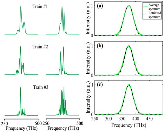 The first and second columns show the typical spectra for trains 1 (top) to 3 (bottom). The third column plots the directly retrieved spectra from the marginal of the PG/TG FROG trace (obtained in and required for the RANA approach) alongside the average spectra—i.e., the spectrometer measurement—for the three trains with average (a) τFWHM = 26 fs, (b) τFWHM = 54 fs, and (c) τFWHM = 108 fs. The retrieved spectra from PG/TG FROG trace marginals match the average spectra of the unstable pulse train.