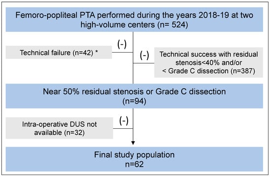 In this retrospective cross-sectional study, data from 62 patients who had undergone percutaneous transluminal angioplasty (PTA) of long femoro-popliteal arteries lesions and intraoperative Doppler ultrasound (DUS) were retrieved. The procedures were performed by highly skilled operators, at two referral hospitals for peripheral interventions, in 2018 and 2019. All patients signed an informed consent form for the procedure. The study diagram and patients’ eligibility criteria are described in Figure 1.