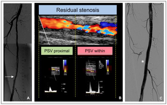 Example of intraoperative DUS assessment of residual stenosis that occurred after PTA of calcified stenosis. (A). Digital subtraction angiography showed intermediate residual stenosis < 50% (white arrow). (B) Intraoperative DUS showed abnormal PSVR within treated segment. (C) Result after bailout stenting that was necessary to fix persistent lesion recoil despite multiple post-dilatation (white asterisk). DUS = Doppler ultrasound. PSV = peak systolic velocity. PTA = percutaneous transluminal angioplasty.