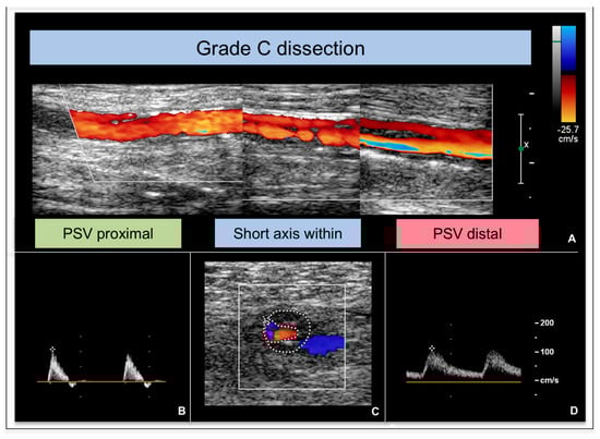 Intraoperative DUS was performed to assess 48 RS in the range of 40–50% and 14 grade C dissections. (Central illustration) Out of the 48 intermediate residual stenoses, 16 (33.3%) showed a PSVR > 2.4, whereas the remaining 32 (77.7%) showed a PSVR < 2.4. Out of the 14 “grade C” dissections assessed, 5 (35.8%) showed an abnormal spectral Doppler within and distally to the dissection, whereas the remaining 9 (64.2%) showed a PSVR < 2.4 within the dissection and a normal spectral Doppler distally to the dissection. Among the five grade C dissections with an abnormal spectral Doppler, a lumen narrowing with a PSVR > 2.4 was documented in four cases; the remaining dissection showed an abnormal spectral Doppler distal to the dissection with a PSVR < 2.4 within.
