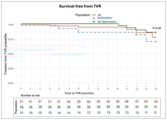 Kaplan Mayer curve for target lesion revascularization (TVR) at follow-up. Analysis was stratified by lesions requiring optimization (blue dotted line) and lesions not requiring optimization (green line). Red line: overall population.