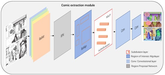 In the comic content extraction module, as shown in Figure 2, we designed a cartoon content segmentation network model. The network model is based on ResNet50 as the backbone network; here, skip connections, which can alleviate the problem of gradient vanishing in deep network training, are used to extract features, , for comics accurately. The region proposal network is used to generate candidate regions for comic frames, dialog bubbles, characters, and so on. Drawing on the Mask R-CNN framework [27], a RoIalign layer is added to retain the original feature data without quantization, to obtain more realistic RoI features and improve the segmentation ability of characters and irregular dialog bubbles in comics. Since the standard Mask R-CNN is not ideal for edge prediction in image segmentation tasks, the generated mask size is only 28 × 28, and the stretched mask cannot accurately correspond to the detailed features of the characters in the comics, making it difficult to perform fine feature extraction.