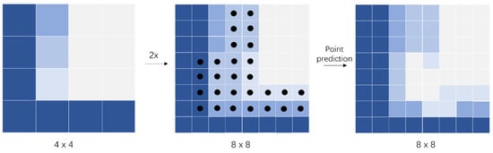 Adaptive subdivision. A prediction is upsampled on a 4 × 4 grid using bilinear interpolation twice. Then, it predicts the blurred N points (black points) to restore the details on the finer mesh.